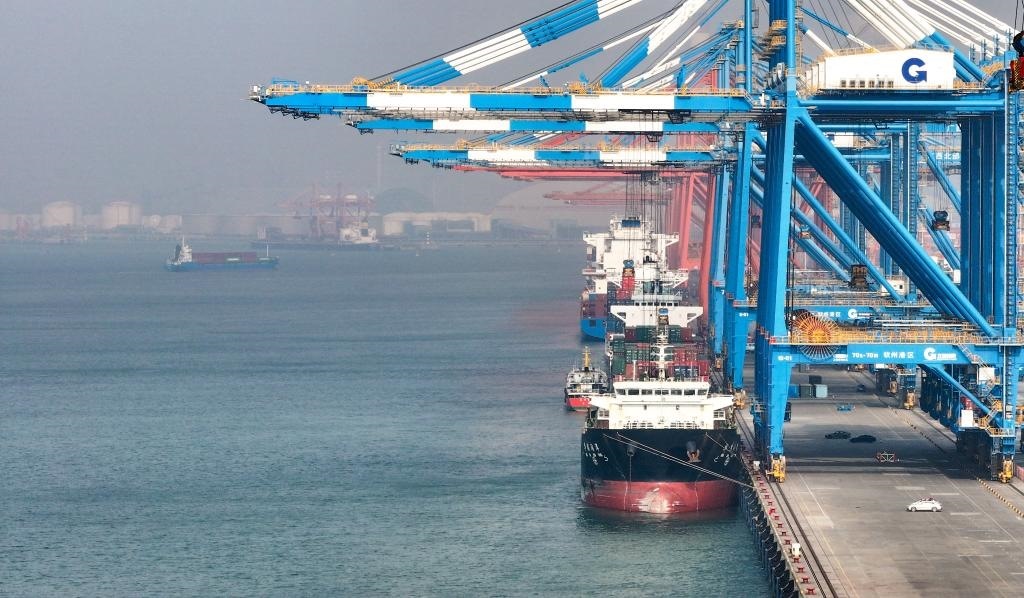 2024年12月31日,遠(yuǎn)洋貨輪在欽州港集裝箱自動化碼頭排隊卸貨(無人機(jī)照片)。新華社記者 呂帥 攝