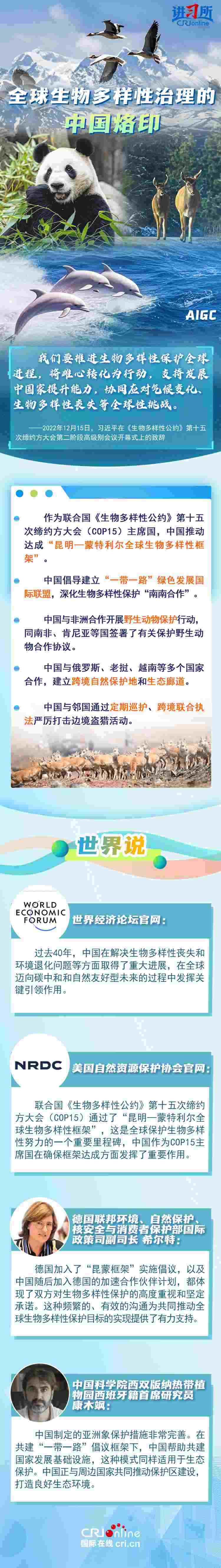 “心往一處想、勁往一處使,共建地球生命共同體?!弊鳛樽钤绾炇?、批準(zhǔn)《生物多樣性公約》的締約方之一,生物多樣性保護(hù)已經(jīng)上升為中國(guó)的國(guó)家發(fā)展戰(zhàn)略。國(guó)際人士表示,中國(guó)的一系列舉措體現(xiàn)出對(duì)生態(tài)環(huán)境保護(hù)的堅(jiān)定決心,同時(shí),中國(guó)依托共建“一帶一路”倡議等國(guó)際合作機(jī)制,為推動(dòng)全球生物多樣性保護(hù)提供了有力支持,在邁向自然友好型未來(lái)的過(guò)程中發(fā)揮關(guān)鍵的引領(lǐng)作用。