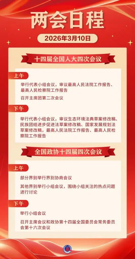 兩會日程預(yù)告丨3月10日:人代會審議“兩高”工作報(bào)告等 政協(xié)舉行界別協(xié)商會議和小組會議