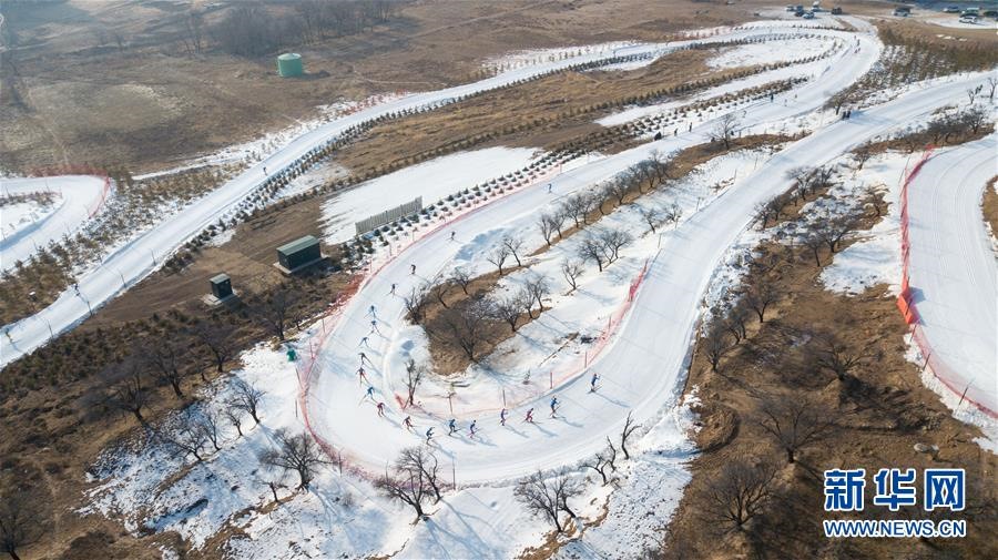 1月12日,參賽選手在青年組男子30公里集體出發(fā)(自由技術(shù))比賽中。1月11日至1月15日,2018-2019年度全國青少年越野滑雪錦標(biāo)賽在內(nèi)蒙古烏蘭察布市涼城縣岱?;﹫雠e行。新華社記者彭源攝