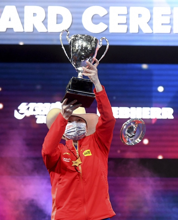 11月29日,王曼昱奪得女單冠軍,在頒獎儀式后手捧冠軍獎杯留影。新華社記者 吳曉凌/攝