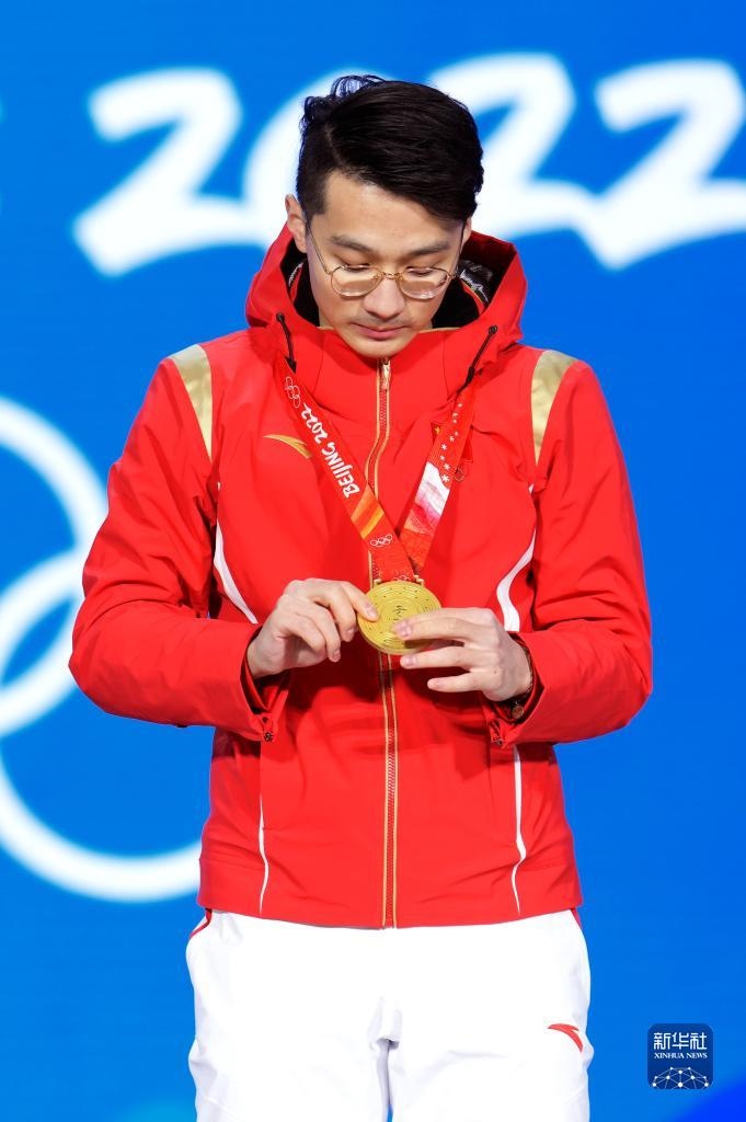 2月8日,亞軍中國隊選手李文龍在獎牌頒發(fā)儀式上。