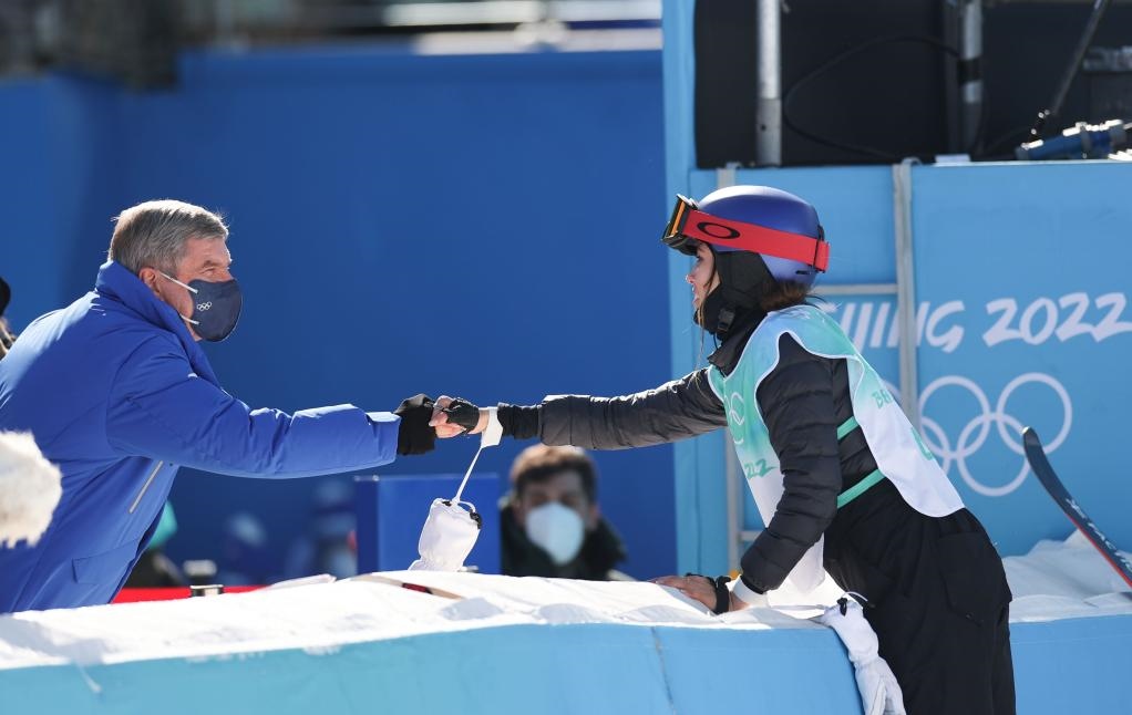2月8日,國際奧委會(huì)主席巴赫(左)向中國選手谷愛凌表示祝賀。新華社記者丁旭攝