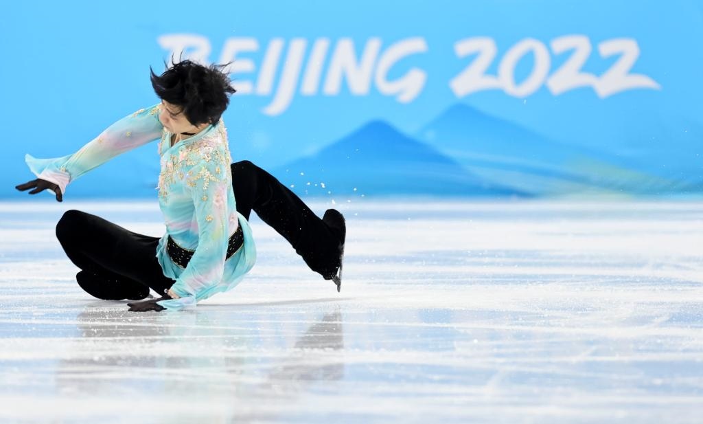 2月10日,日本選手羽生結(jié)弦在男單自由滑比賽中失誤。新華社記者蘭紅光攝