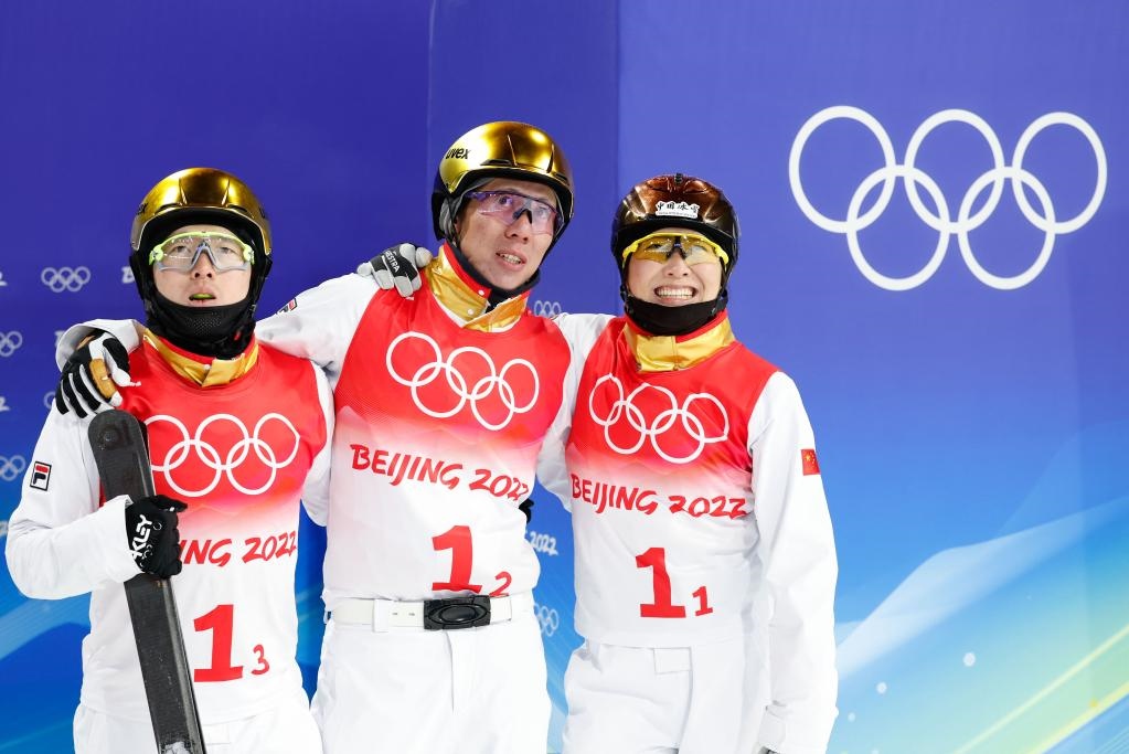 2月10日,中國隊選手賈宗洋(中)、徐夢桃(右)和齊廣璞(左)在自由式滑雪空中技巧混合團體比賽后等待成績公布。新華社記者費茂華攝