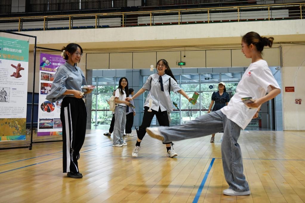 5月23日,在四川大學(xué)江安校區(qū)體育館,學(xué)生在體驗傳統(tǒng)體育項目踢毽子。新華社記者胥冰潔攝