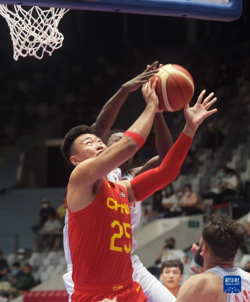 7月14日,中國(guó)隊(duì)球員王哲林(前中)在比賽中拼搶。新華社發(fā)(祖卡南攝)