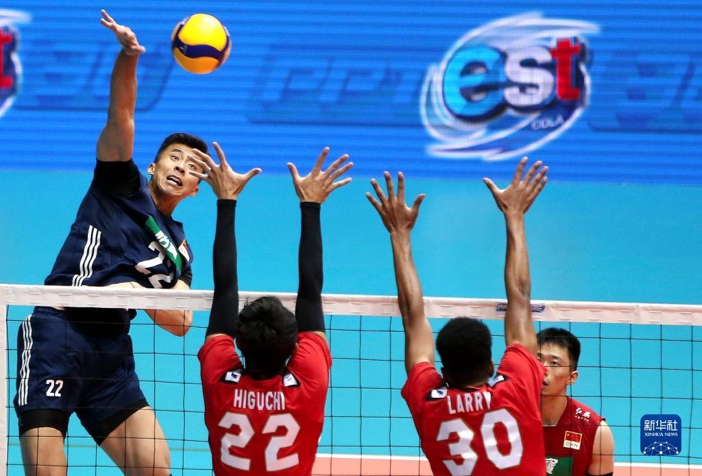 8月14日,中國(guó)隊(duì)球員張景胤(右一)在比賽中扣球。新華社記者 王騰 攝