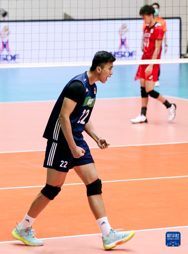 8月14日,中國(guó)隊(duì)球員張景胤(上)在比賽中扣球。新華社記者 王騰 攝