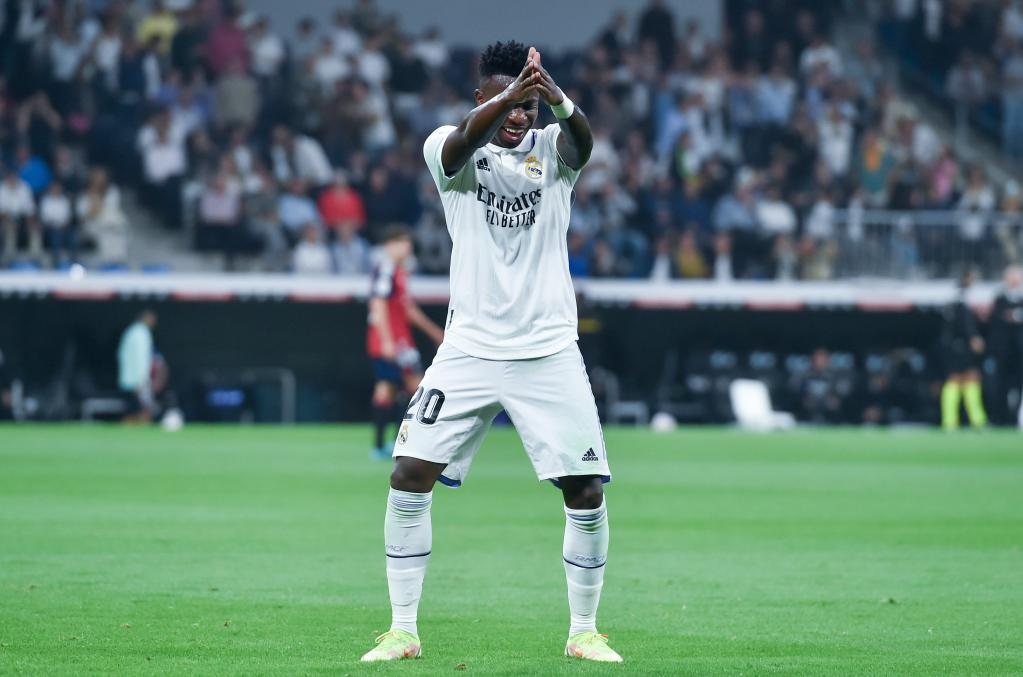 10月2日,代表皇馬出賽的維尼修斯在西甲比賽中慶祝進球。新華社發(fā)(古斯塔沃·巴連特攝)