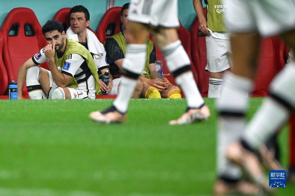 11月27日,德國隊球員伊爾凱·京多安(左一)與托馬斯·穆勒(左二)在比賽中被替換下場后。新華社記者 李尕 攝