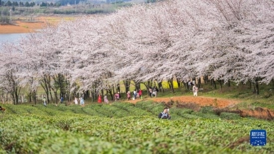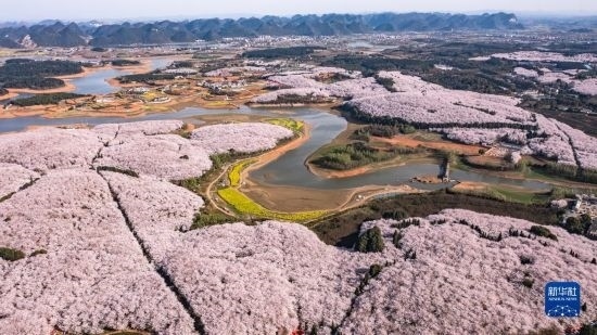 近日,貴州省貴安新區(qū)櫻花園內(nèi)的2.4萬畝櫻花競相綻放,如雪似霞,吸引游客前來賞花觀光。