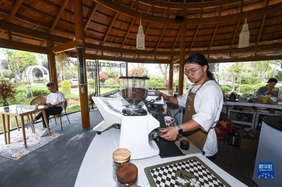 4月11日,工作人員在伍浦村漁耕文化園的陶灣里鄉(xiāng)村咖啡店工作。