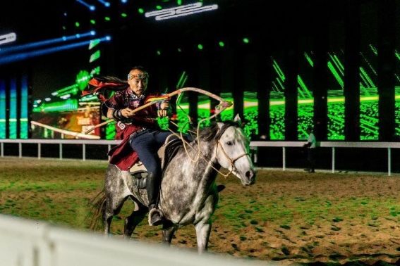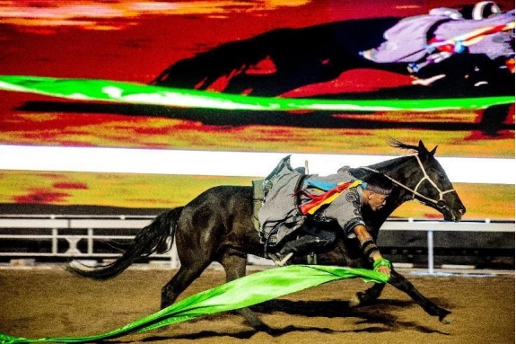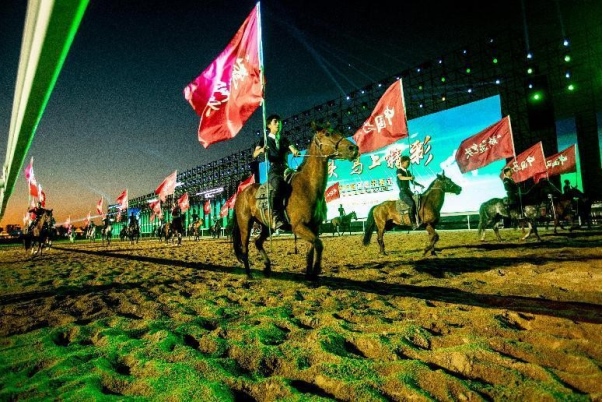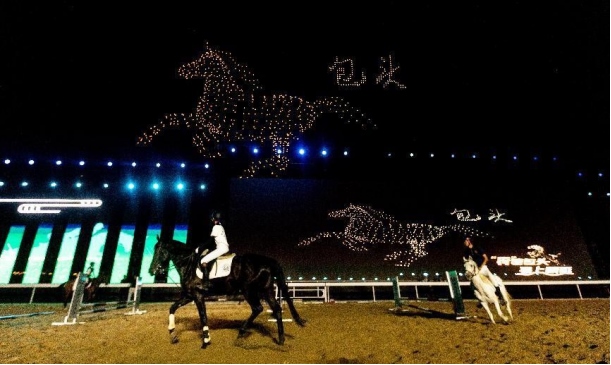 開(kāi)幕式文體表演由《馬術(shù)方陣一馬當(dāng)先》、歌伴舞《我的城我的馬》、《名馬展示策馬揚(yáng)鞭》、《單馬技巧雙翼神馬》、《馬障礙秀躍馬揚(yáng)鞭》、《馬術(shù)秀人馬合一》、歌伴舞《騎跡包頭》、《無(wú)人機(jī)秀馬上精彩》八塊內(nèi)容組成。當(dāng)晚的賽汗塔拉馬術(shù)賽場(chǎng)流光溢彩、氣氛熱烈,場(chǎng)內(nèi)座無(wú)虛席、歡聲雷動(dòng)。20時(shí)30分許,主騎手手持國(guó)旗,副騎手手持馬城旗幟,運(yùn)動(dòng)員方陣、民族方陣、女騎方陣、馬主方陣入場(chǎng),騎手們精神飽滿(mǎn)、英姿颯爽,不時(shí)揮手致意,現(xiàn)場(chǎng)觀眾用熱烈的掌聲和歡呼聲,歡迎他們的到來(lái)。達(dá)茂旗9歲賽馬冠軍阿茹樂(lè)手持彩旗引出世界名馬亮相,40對(duì)人馬合一的“千古馬頌”表演震撼全場(chǎng),1000架無(wú)人機(jī)躍然天空,點(diǎn)亮“騎跡包頭 馬上精彩”的字樣……藍(lán)天、碧水、凈土的包頭在策馬奔騰的馬術(shù)競(jìng)技中拉開(kāi)了“中國(guó)馬城”的壯麗畫(huà)卷。