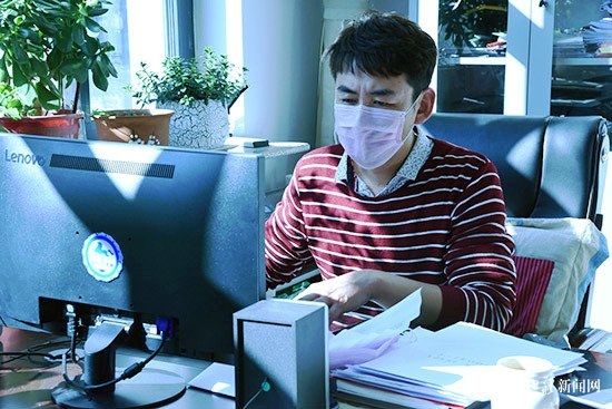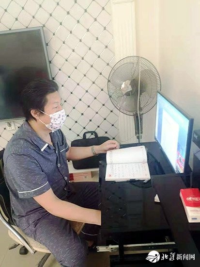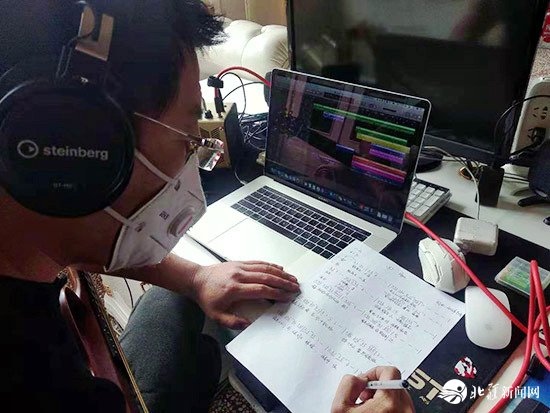 喀喇沁旗烏蘭牧騎隊(duì)長(zhǎng)吳國(guó)輝在家中創(chuàng)作快板作品《為逆行者點(diǎn)贊》。受訪者供圖
