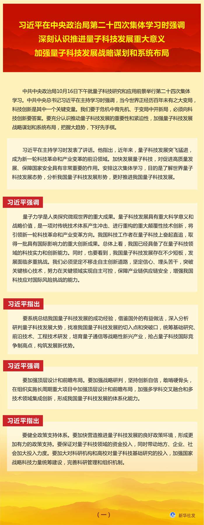 中共中央政治局10月16日下午就量子科技研究和應(yīng)用前景舉行第二十四次集體學(xué)習(xí)。中共中央總書記習(xí)近平在主持學(xué)習(xí)時強調(diào),當(dāng)今世界正經(jīng)歷百年未有之大變局,科技創(chuàng)新是其中一個關(guān)鍵變量。我們要于危機中育先機、于變局中開新局,必須向科技創(chuàng)新要答案。要充分認(rèn)識推動量子科技發(fā)展的重要性和緊迫性,加強量子科技發(fā)展戰(zhàn)略謀劃和系統(tǒng)布局,把握大趨勢,下好先手棋。