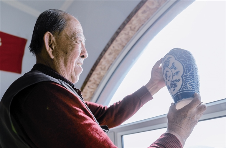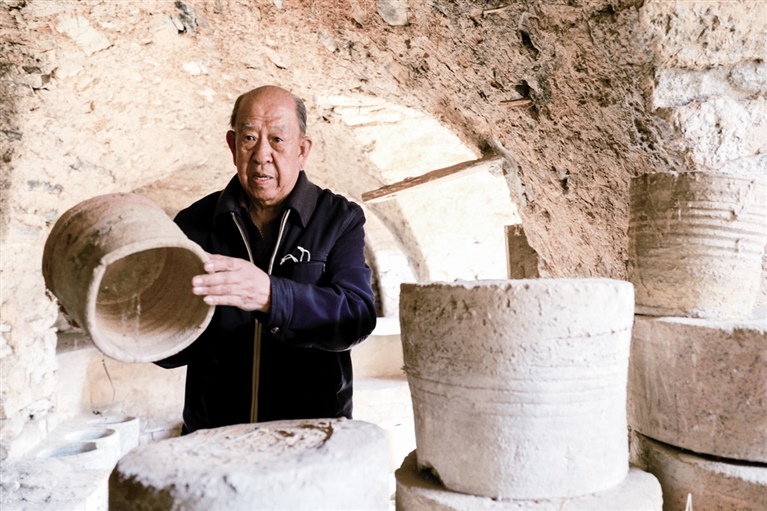 隨后,他走進“饅頭窯”旁邊的一口窯洞,這是當時張家的一間手工作坊,揉泥、拉坯、上釉等一系列制作陶瓷的工序都是在這里完成。“我就出生在這個村子,已經(jīng)是張家瓷藝的第九代傳人了。作為中國磁州窯譜系,清水河黑礬溝瓷藝生產(chǎn)歷史至少已有800年?!标P(guān)于這項非遺的歷史故事,張選老人向記者娓娓道來:大約400年前,他們張家走西口從山西來到清水河謀生,當時清水河黑礬溝有一家姓杜的人家做陶瓷營生,張家的先人在杜家打工,大概這樣打工做了三輩人吧,杜家忽然不做了,搬離了黑礬溝,他們張家便把杜家的產(chǎn)業(yè)買了下來繼續(xù)做?!澳莻€時候黑礬溝生產(chǎn)的瓷器都與人們生活息息相關(guān),比如腌菜缸、水甕、碗盤等,一個家庭手工作坊一天能生產(chǎn)500個碗呢,生意很好,人們靠做這個營生也過上了不錯的生活?!睆堖x回憶著清水河瓷藝鼎盛時期的場景。上個世紀70年代,由于交通、技術(shù)等原因,黑礬溝燃燒了幾百年的窯火熄滅,傳統(tǒng)“饅頭窯”被正式廢棄,轉(zhuǎn)移到窯溝鄉(xiāng)后手工作坊變成了機械化生產(chǎn),這也讓清水河的陶瓷名聲大噪。當時,在窯溝鄉(xiāng)一帶,從事陶瓷生產(chǎn)的有近萬人,陶瓷業(yè)成為清水河支柱產(chǎn)業(yè)。