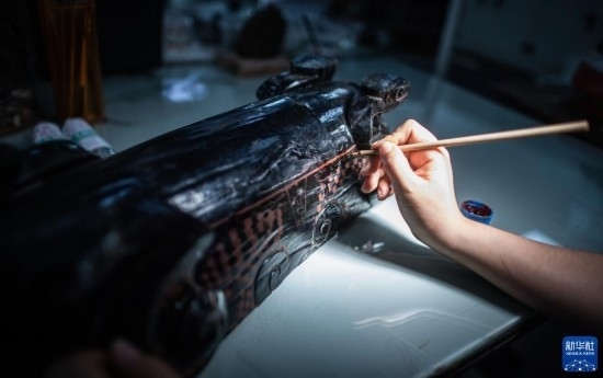 5月20日,在荊州文物保護(hù)中心,修復(fù)人員李寧修復(fù)一件戰(zhàn)國(guó)獸形酒具盒。