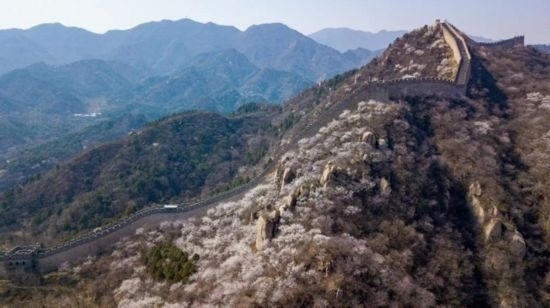 仲春時(shí)節(jié),八達(dá)嶺東段的水關(guān)長城山花爛漫,自然與人文景觀交相輝映。(新華社發(fā)陳鐘昊 攝)