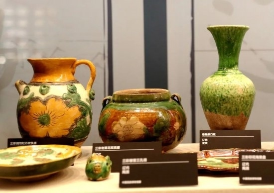 “遼三彩”直接承襲和模仿“唐三彩”,成為中華陶瓷文化傳承發(fā)展史上的重要一環(huán)。后排文物從左到右依次是:三彩刻劃牡丹紋執(zhí)壺、三彩劃葵花雙系罐、綠釉敞口瓶。(民族畫報(bào)記者 鷹鴿 攝)