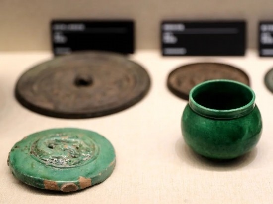 前排左:綠釉龍紋瓦當(dāng) 金代 首都博物館藏;前排右:定窯綠釉矮領(lǐng)罐 金代 中國(guó)民族博物館藏。(民族畫報(bào)記者 鷹鴿 攝)