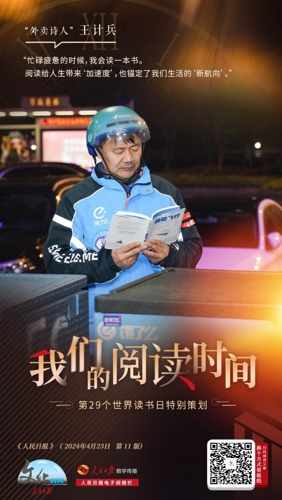 “我的外賣箱里總會放一本書,在等外賣的間隙或者訂單空閑的時候看,現(xiàn)在主要在手機上閱讀。”如今,王計兵已創(chuàng)作5000多首詩歌,出版3本詩集,還在進行非虛構(gòu)寫作。他說:“閱讀給我的人生帶來‘加速度’,為忙碌的生活錨定方向感?!?/p>