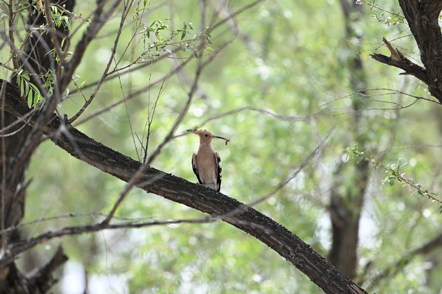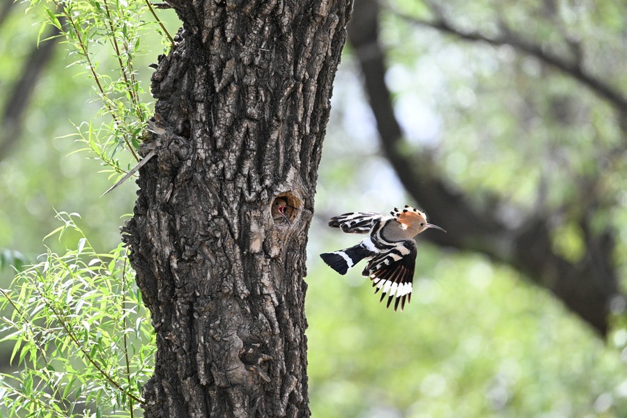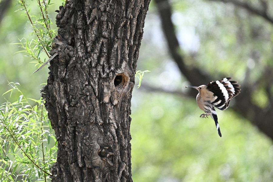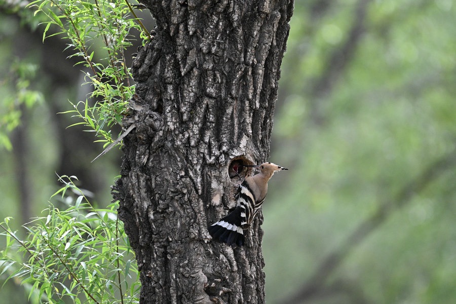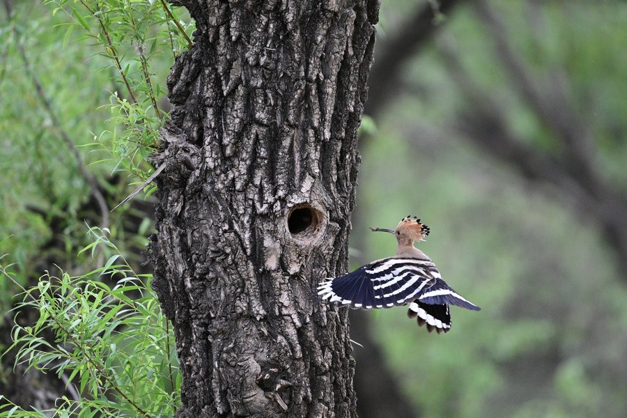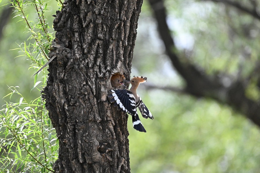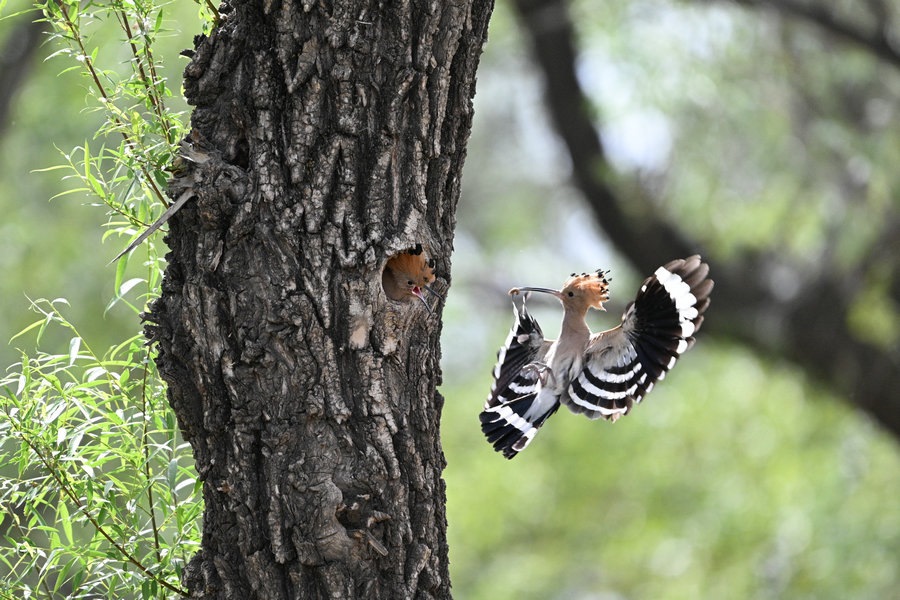 6月4日,呼和浩特市玉泉區(qū)大黑河沿岸,戴勝鳥(niǎo)在樹(shù)林、草叢中覓食,捉到蟲(chóng)子飛回窩喂給鳥(niǎo)寶寶,3個(gè)小時(shí)內(nèi)往返數(shù)十次。吸引了眾多攝影愛(ài)好者前來(lái)拍攝。