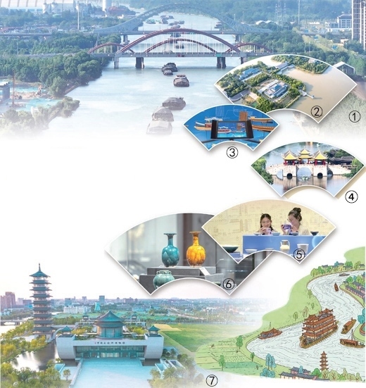 圖①:在大運(yùn)河揚(yáng)州段,裝載貨物的船舶在航道上有序航行,來(lái)往如梭。孟德龍攝(影像中國(guó)) 圖②:位于大運(yùn)河揚(yáng)州段的南水北調(diào)東線工程。陳 揚(yáng)攝(影像中國(guó)) 圖③:中運(yùn)博“運(yùn)河上的舟楫”展廳。圖④:揚(yáng)州瘦西湖風(fēng)光。孟德龍攝(影像中國(guó))圖⑤:游客在中運(yùn)博參觀。孟德龍攝(影像中國(guó)) 圖⑥:中運(yùn)博“中茲神州——絢爛的唐代洛陽(yáng)城”展廳中的展品。圖⑦:中運(yùn)博外景。圖③⑥⑦均為中運(yùn)博提供