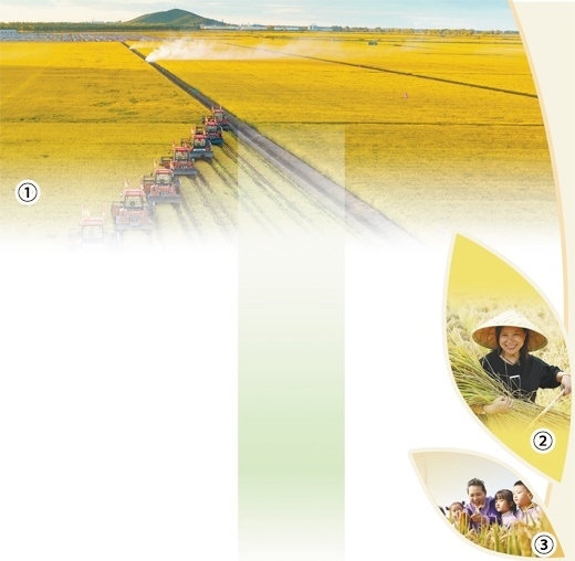 圖①:黑龍江省佳木斯市北大荒千萬畝水稻開鐮。國 徽攝(影像中國) 圖②:河北省唐山市水稻喜獲豐收。朱大勇攝(人民視覺) 圖③:山東省臨沂市沂南縣大莊鎮(zhèn)翔宇幼兒園的小朋友在稻田聽老師講解水稻種植知識。杜昱葆攝(人民視覺)