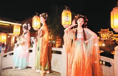 洛邑古城相關(guān)負(fù)責(zé)人介紹,景區(qū)致力于漢服文化的推廣與傳承,創(chuàng)意打造穿越新場(chǎng)景,豐富文旅新業(yè)態(tài)。景區(qū)有24個(gè)朝代的漢服形制、56個(gè)民族的服飾款式,游客可找到各自喜歡的款式,扮演喜愛的角色。燈獅畫橋、香羅幔天、文峰暮鼓等30余處場(chǎng)景,讓游客盡享“穿越自由”。洛邑古城還策劃了一系列創(chuàng)新主題活動(dòng),讓身著漢服的游客與“李白”“武則天”談古論今,與“嫦娥”“牡丹花神”近距離互動(dòng)。