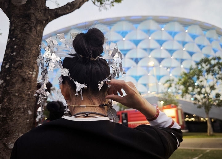 2024年11月20日,一名女子在三亞市體育中心場館外整理頭飾。新華社記者 李尕 攝