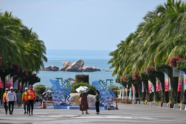 2024年11月19日,游客從位于三亞天涯海角游覽區(qū)的運動會吉祥物前經(jīng)過。新華社記者 陳澤國 攝