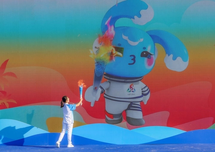 2024年11月17日,火炬手韓曉燕在三亞進行的火炬實地傳遞活動起跑儀式上與本屆運動會吉祥物“吉貝”對接,點燃火炬。新華社記者 陳朔 攝