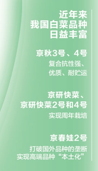 近年來,我國(guó)白菜育種實(shí)力突飛猛進(jìn),品種日益豐富,實(shí)現(xiàn)了從單一“秋播冬貯”向優(yōu)勢(shì)產(chǎn)區(qū)生產(chǎn)、產(chǎn)品多樣化和周年生產(chǎn)轉(zhuǎn)變。培育出了復(fù)合抗性強(qiáng)、優(yōu)質(zhì)、耐貯運(yùn)的品種“京秋3號(hào)、4號(hào)”等,高品質(zhì)、速生苗用品種“京研快菜、京研快菜2號(hào)和4號(hào)”3個(gè)品種搭配實(shí)現(xiàn)了周年栽培,解決了生產(chǎn)上長(zhǎng)期缺乏冬春和夏季栽培專用品種的難題。還育成了娃娃菜、快菜、紹菜、金絲白等高品質(zhì)品種,尤其是“京春娃2號(hào)”一舉打破國(guó)外品種的壟斷,它比國(guó)外品種早熟5至7天,種植密度高25%,畝收入增長(zhǎng)30%,已成為國(guó)產(chǎn)娃娃菜第一大品種,實(shí)現(xiàn)了高端品種的“本土化”。