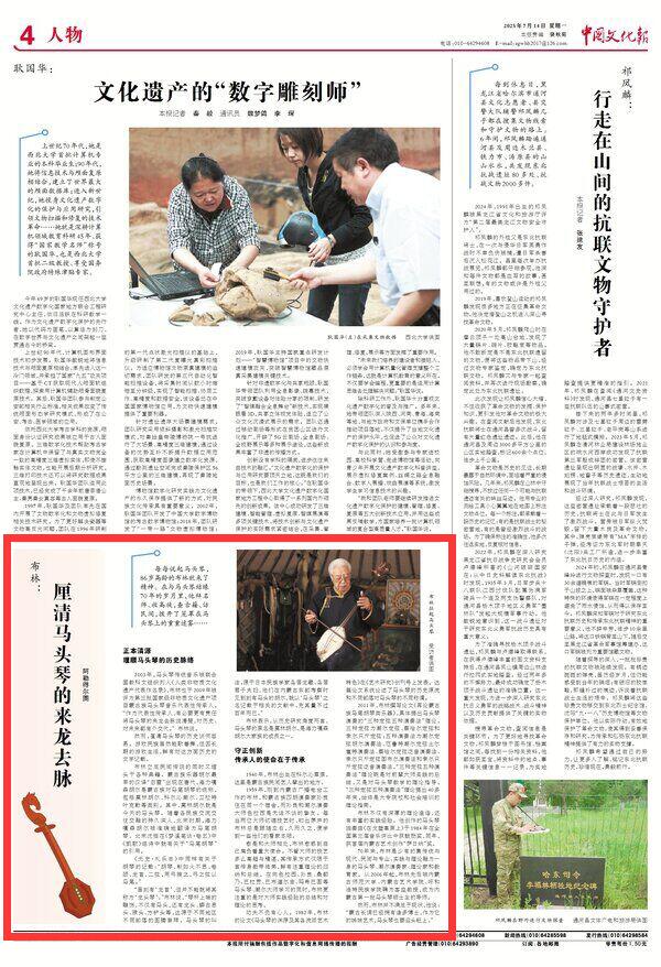 2025年7月14日《中國文化報》第4版刊發(fā)了題為《布林:厘清馬頭琴的來龍去脈》的文章,報道了做為非物質(zhì)文化遺產(chǎn)項(xiàng)目蒙古族馬頭琴音樂代表性傳承人的布林立足民間傳說的同時又埋頭于各種典籍。他說作為代表性傳承人,有必要更有責(zé)任將馬頭琴的來龍去脈說清楚,對歷史、對未來都有個交代。