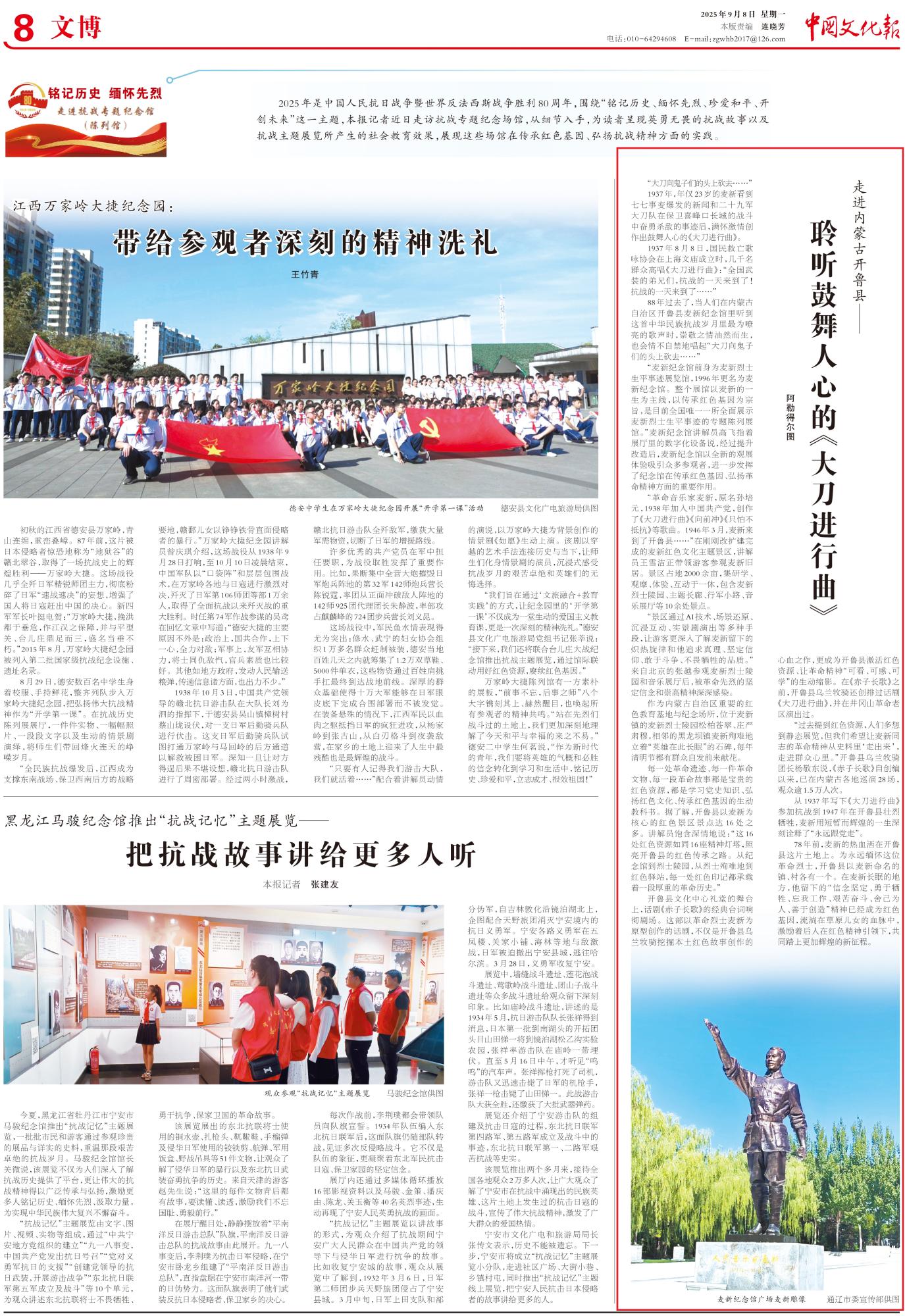 2025年9月8日,《中國文化報》第8版整版刊發(fā)題為《走進內蒙古開魯縣——聆聽鼓舞人心的《大刀進行曲》》的文章,報道了內蒙古開魯縣麥新紀念館以麥新的一生為主線,以傳承紅色基因為宗旨,是目前全國唯一一所全面展示麥新烈士生平事跡的專題陳列展館。經過提升改造后,麥新紀念館以全新的觀展體驗吸引眾多參觀者,進一步發(fā)揮了紀念館在傳承紅色基因、弘揚革命精神方面的重要作用。