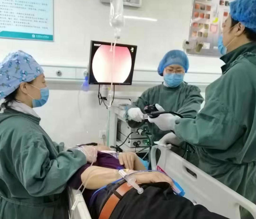 麻醉科王虹和腔鏡室王一平大夫安娜護(hù)士進(jìn)行無痛胃鏡檢查