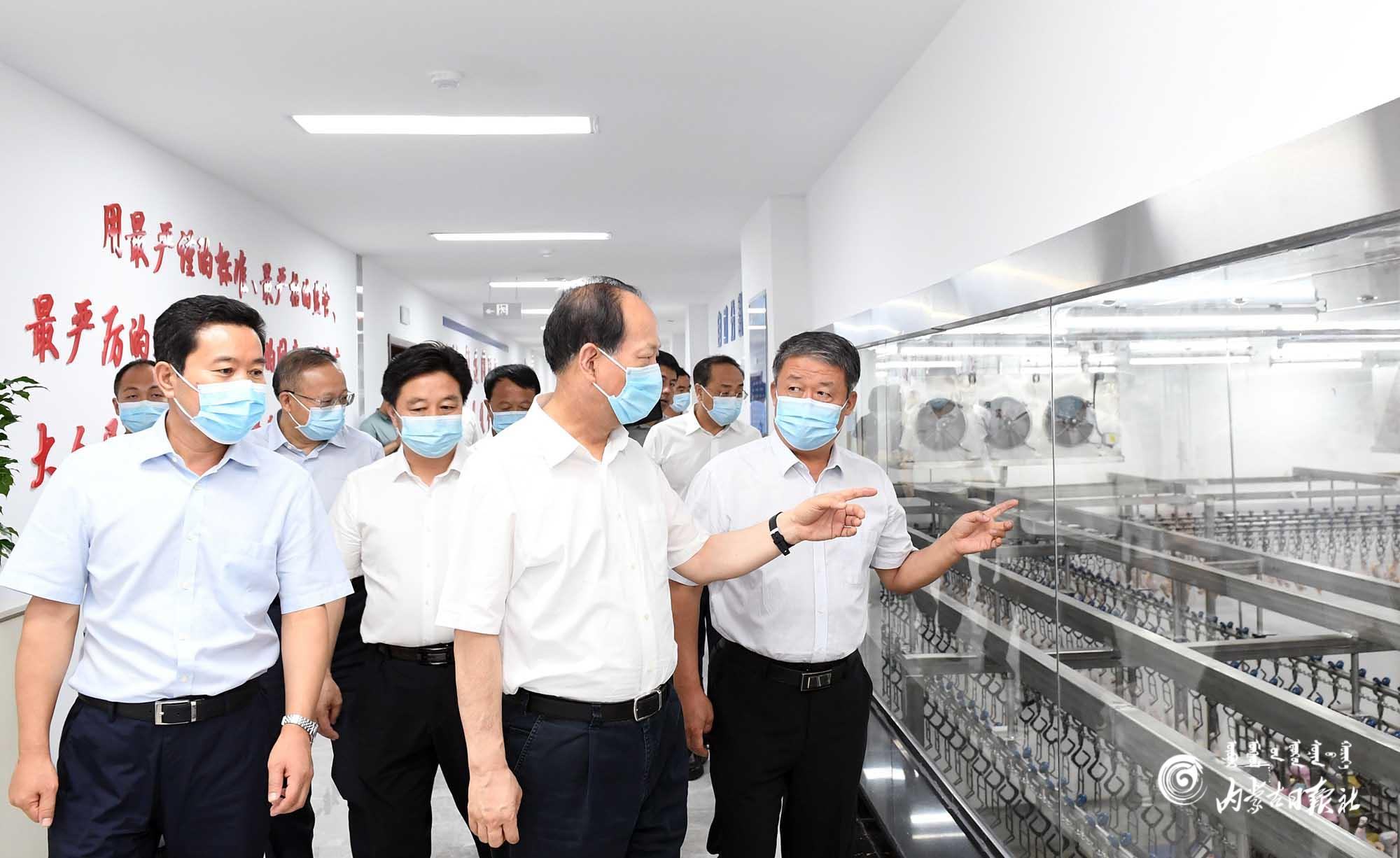 抓項目、興產(chǎn)業(yè)對于做好“六穩(wěn)”工作、落實“六?!比蝿?wù)至關(guān)重要。石泰峰走進(jìn)金伯利農(nóng)莊、草原宏寶食品公司、金麥提升農(nóng)機裝備制造公司、潤海源肉雞屠宰加工廠、天衡制藥公司等地,深入考察項目推進(jìn)、企業(yè)經(jīng)營、產(chǎn)業(yè)鏈建設(shè)、供應(yīng)鏈保障等情況。他指出,河套灌區(qū)發(fā)展現(xiàn)代農(nóng)牧業(yè)責(zé)任重大、潛力巨大,要堅持生態(tài)優(yōu)先、綠色發(fā)展鮮明導(dǎo)向,堅持一二三產(chǎn)業(yè)融合發(fā)展,學(xué)習(xí)先進(jìn)經(jīng)驗,更新發(fā)展理念,創(chuàng)新經(jīng)營模式,提升科技水平,著力推動農(nóng)牧業(yè)向集約化、規(guī)?;⒅悄芑?、高端化方向發(fā)展,切實做好做足現(xiàn)代農(nóng)牧業(yè)這篇大文章。金草原現(xiàn)代養(yǎng)殖園飼養(yǎng)胡羊15萬只,智能化圈舍內(nèi)溫控、噴淋、全自動飲水、電動刮糞裝置一應(yīng)俱全,撒料、消毒等一鍵完成,舒緩的音樂縈繞耳邊。石泰峰指出,像這樣的現(xiàn)代化規(guī)模養(yǎng)殖,不僅能夠有效提高產(chǎn)業(yè)發(fā)展水平和帶動農(nóng)牧民增收,而且有利于解決草畜平衡問題、減少自然放養(yǎng)對草原生態(tài)的影響,要革命性地變革養(yǎng)殖方式,用工業(yè)化的思維和方式推進(jìn)農(nóng)牧業(yè)發(fā)展,充分發(fā)揮龍頭企業(yè)的引領(lǐng)作用,不斷完善農(nóng)企利益聯(lián)結(jié)機制,實行標(biāo)準(zhǔn)化全流程管理,完善農(nóng)畜產(chǎn)品可追溯體系,推進(jìn)產(chǎn)加銷一體化發(fā)展,實現(xiàn)產(chǎn)品有市場、質(zhì)量有保證、農(nóng)牧民有收益、企業(yè)有效益。要精心謀劃推進(jìn)農(nóng)業(yè)和旅游融合發(fā)展,努力把河套大地的特色農(nóng)業(yè)種出好風(fēng)景、種出高效益。他強調(diào),時間就是金錢,時間不等人,各地區(qū)各有關(guān)部門要緊抓施工黃金期,加大力度、加快進(jìn)度推進(jìn)各類重點項目建設(shè),有關(guān)方面要全力幫助解決項目推進(jìn)中遇到的困難和問題,積極主動做好服務(wù)保障工作,促進(jìn)項目早落地早達(dá)產(chǎn),帶動就業(yè)、穩(wěn)定經(jīng)濟(jì)。