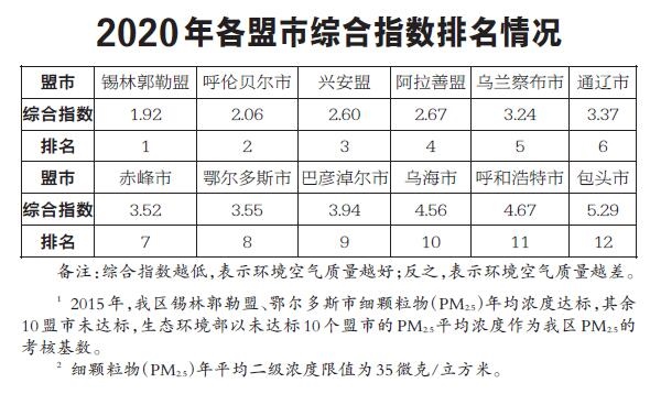 2020年1—12月,全區(qū)環(huán)境空氣質量優(yōu)良天數(shù)比例平均為90.8%。12個盟市優(yōu)良天數(shù)比例由高至低依次為:呼倫貝爾市(100.0%)、錫林郭勒盟(98.9%)、興安盟(97.0%)、赤峰市(95.1%)、阿拉善盟(94.8%)、烏蘭察布市(94.8%)、通遼市(91.0%)、鄂爾多斯市(90.7%)、巴彥淖爾市(84.1%)、烏海市(83.1%)、呼和浩特市(80.3%)和包頭市(79.5%)。