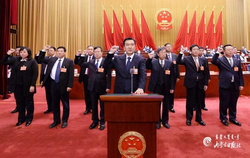 1月30日上午,內(nèi)蒙古人民會堂國徽高懸,五星紅旗鮮艷奪目,自治區(qū)十三屆人大四次會議新當選人員憲法宣誓儀式在這里舉行。