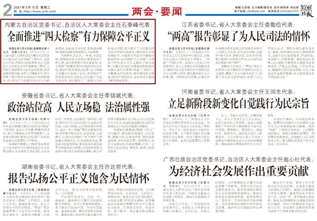 3月10日《檢察日報(bào)》第2版——內(nèi)蒙古自治區(qū)黨委書記、自治區(qū)人大常委會主任石泰峰代表:全面推進(jìn)“四大檢察”有力保障公平正義
