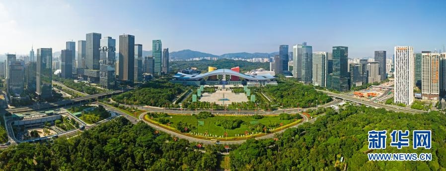 這是2020年10月2日拍攝的深圳市民中心和蓮花山公園一線(無(wú)人機(jī)照片)。新華社記者梁旭攝