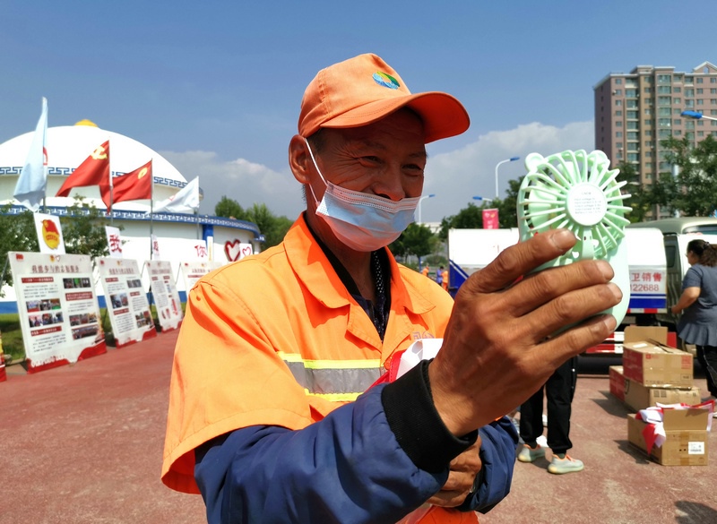 “這么熱的天氣,能給我們環(huán)衛(wèi)工人送來(lái)清涼包,太感謝了!”在呼和浩特回民區(qū)成吉思汗大街環(huán)衛(wèi)所做環(huán)衛(wèi)工作的張有義難掩高興的心情,立即打開(kāi)清涼包中的小電風(fēng)扇,給自己先“清涼”一下。除了風(fēng)扇外,還有可在酷暑夏日為環(huán)衛(wèi)工人們提神醒腦的清涼油,以及可為他們?cè)趧趧?dòng)后第一時(shí)間保持手部衛(wèi)生的免洗洗手液,這些貼心的隨身用品無(wú)疑是在這個(gè)季節(jié)里對(duì)他們健康的最好關(guān)愛(ài)。