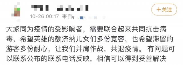 在社交媒體上,一名王姓女士通過短視頻呈現了一家人滯留額濟納的境況,在視頻中,她為同樣滯留在此的游客鼓勁:“如果你此時正在阿拉善,愿你如胡楊般堅強,積極應對疫情?!边@條短視頻發(fā)出數小時,就吸引了20余萬瀏覽量?! ?/p>