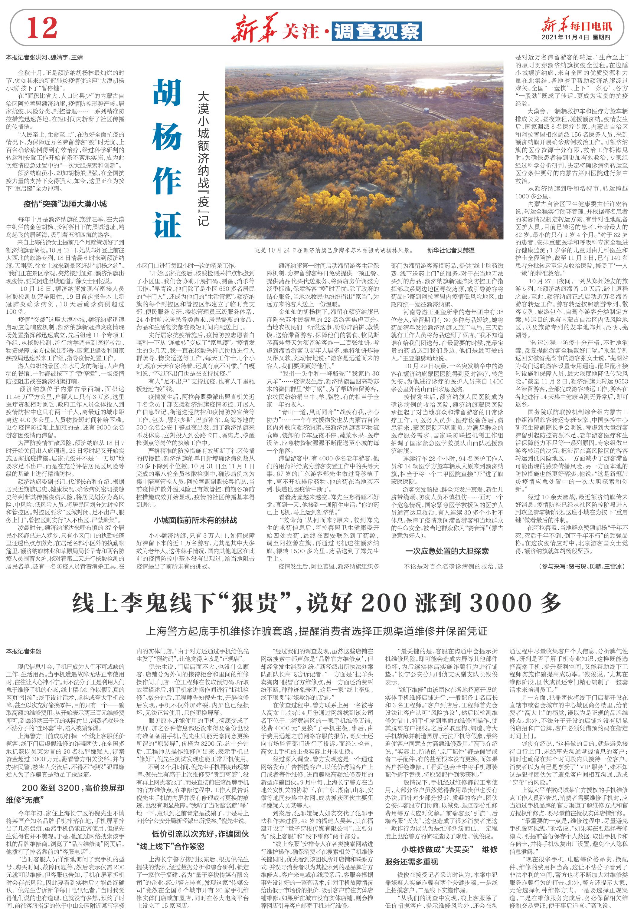 來(lái)自上海的徐女士提前幾個(gè)月就策劃好了到額濟(jì)納旗看胡楊。10月13日,她從鄭州登上前往大西北的旅游專列,18日清晨6時(shí)來(lái)到額濟(jì)納旗。天剛亮,徐女士就來(lái)到景區(qū)趕赴“胡楊之約”?!拔覀冋诰皡^(qū)參觀,突然接到通知,額濟(jì)納旗出現(xiàn)疫情,要關(guān)閉進(jìn)出城通道?!毙炫炕貞浾f。