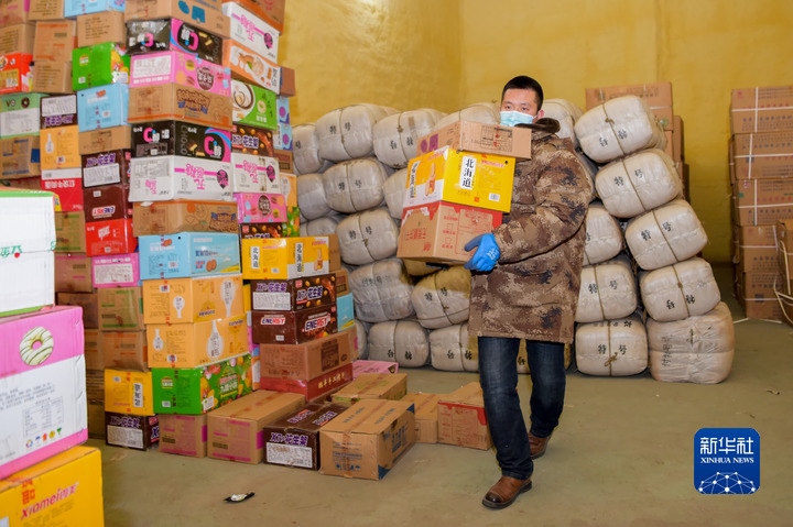 12月7日,在滿洲里市一物資儲備庫,工作人員王永亮在搬運(yùn)物資。新華社記者魏婧宇 攝