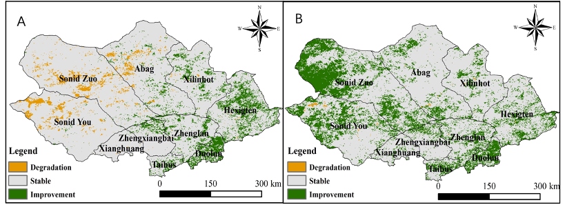 渾善達克沙地植被質(zhì)量變化空間分異參考基線(A)與現(xiàn)狀(B) 。圖源:中國林科院荒漠化研究所