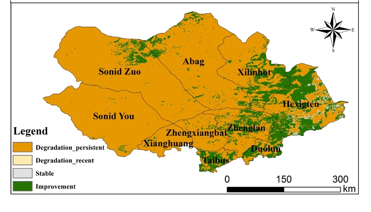論文通訊作者王鋒研究員進一步解釋說,該評估框架以16年為評價時段,間隔5年開展生態(tài)系統(tǒng)生態(tài)質(zhì)量評價。將2000-2015年的生態(tài)質(zhì)量作為參考基線,2005-2020年的生態(tài)質(zhì)量作為現(xiàn)狀,通過生態(tài)系統(tǒng)現(xiàn)狀質(zhì)量與參考基線質(zhì)量的比較開展評價。使用歸一化植被指數(shù)、土壤有機碳和沙塵暴三個指標分別代表植被、土壤和大氣質(zhì)量,每個指標變化包括提高、穩(wěn)定和退化3個水平。三個指標通過邏輯運算而非權重計算獲得生態(tài)系統(tǒng)質(zhì)量指標變化,兼顧了不同響應速率指標變化對生態(tài)系統(tǒng)質(zhì)量的影響。若三個指標中有一項退化,生態(tài)質(zhì)量指標即為退化。