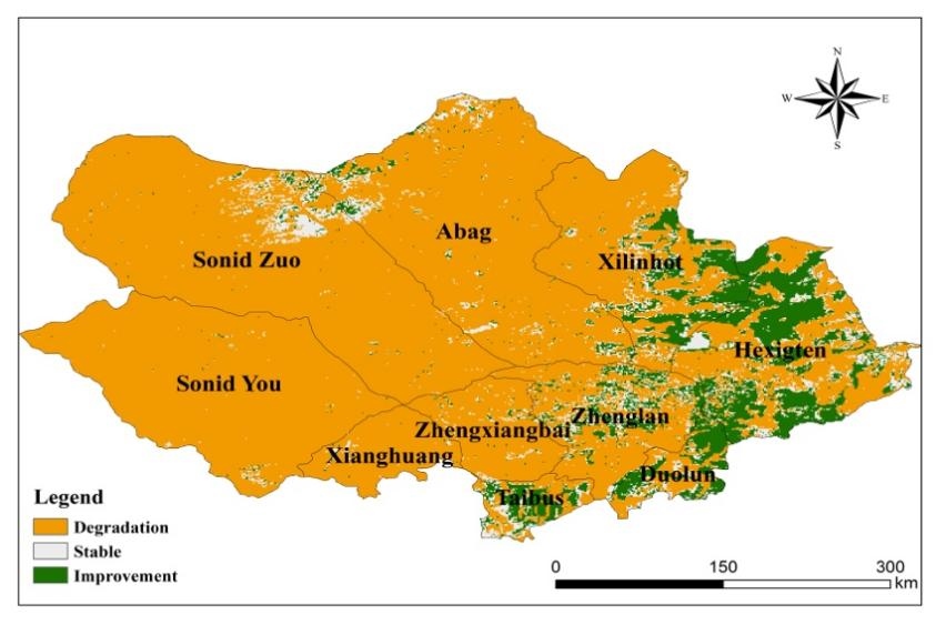 隨著國家生態(tài)恢復工程的啟動,渾善達克沙地未出現(xiàn)新的生態(tài)質(zhì)量退化區(qū)域,目前生態(tài)系統(tǒng)質(zhì)量提高區(qū)域占沙地五分之一,主要分布在東部。