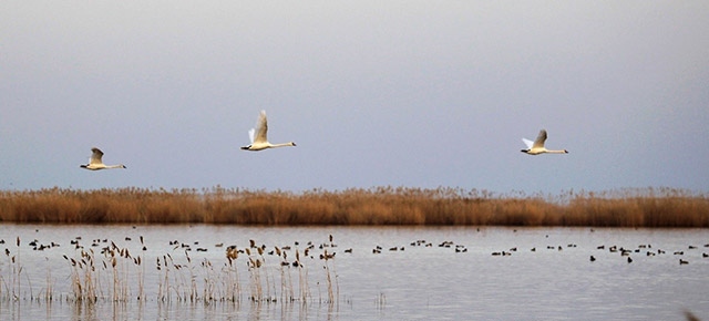 蘆葦蕩漾,鴻雁飛翔。此刻,鳥(niǎo)類攝影愛(ài)好者馬海明扛起他的相機(jī),駕著破冰艇駛向?yàn)趿核睾5纳钐帯K届o地說(shuō):“再過(guò)些日子,這里的鳥(niǎo)更多、魚(yú)更歡,拍出來(lái)的照片會(huì)更美更精彩?!?/p>